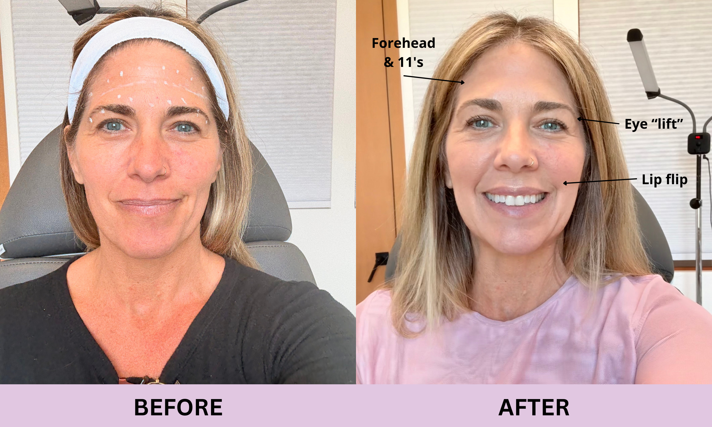 Subtle Botox effects before and 1 week after forehead, frown lines, “eye-lift” and lip flip (age 51).